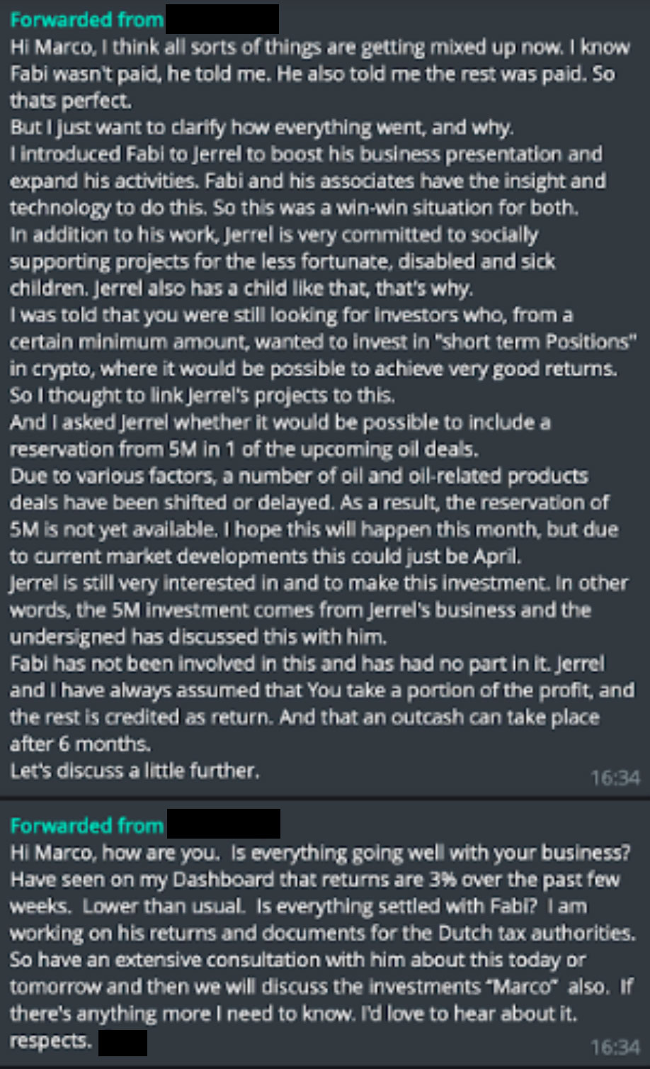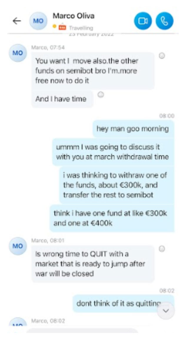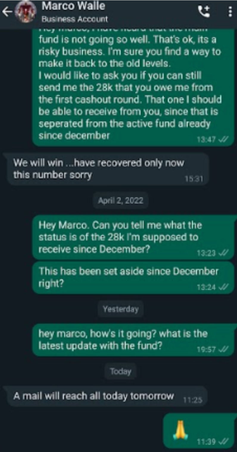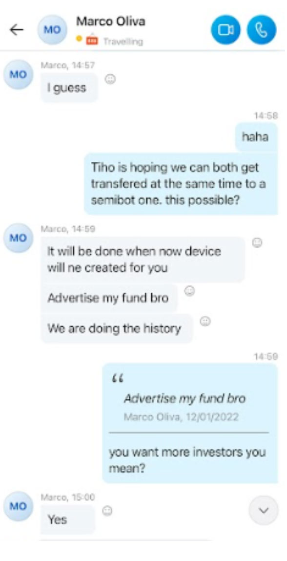 We managed to get hold of some transcripts of various conversations that some of the investors had with Marco either before or after parting with their funds. These were either on whatsapp, skype or email.