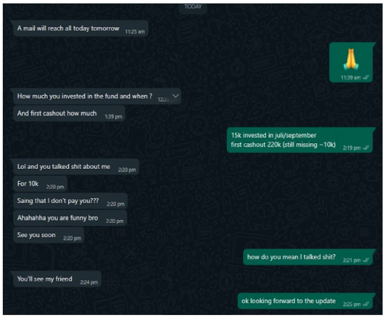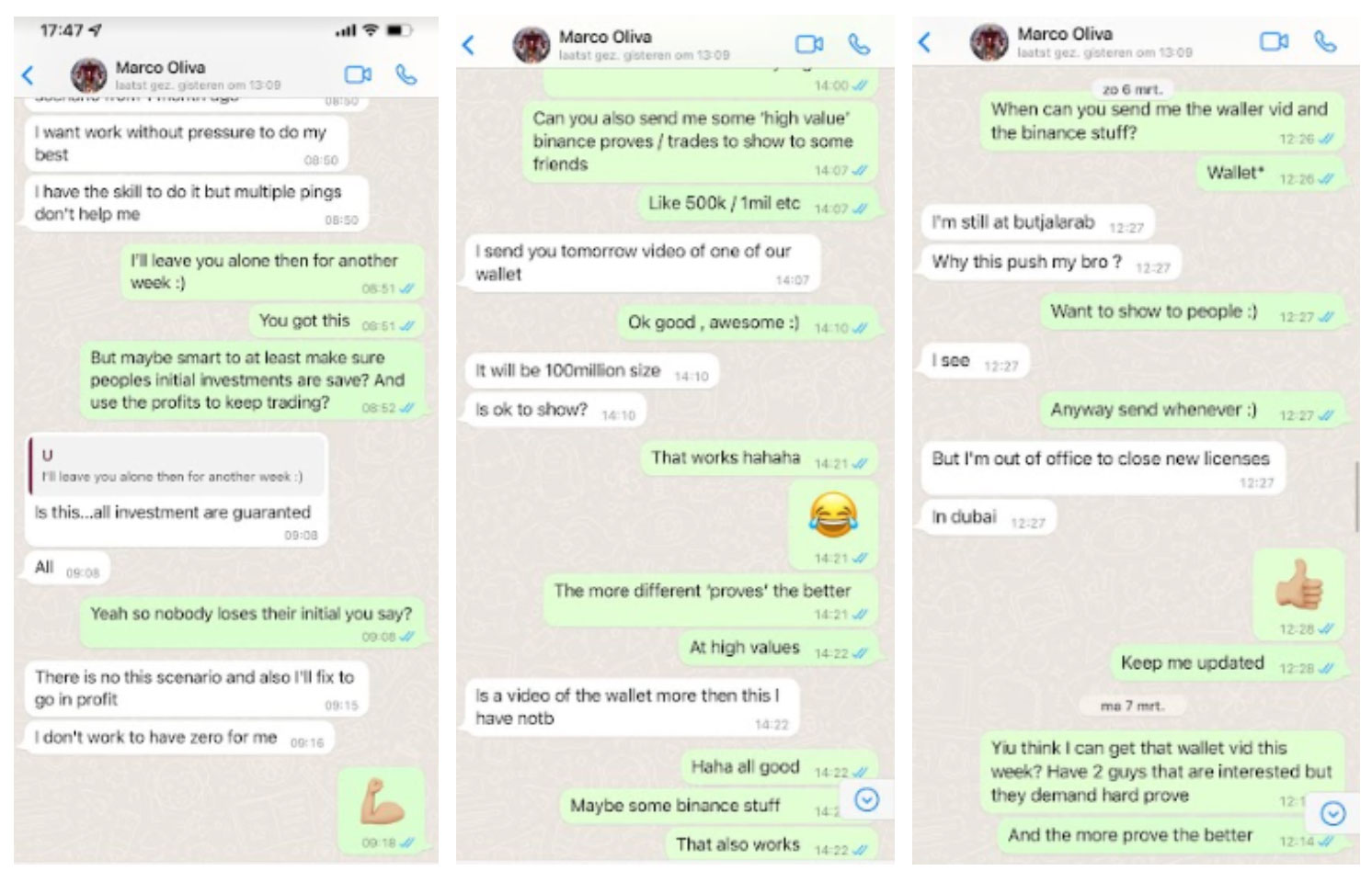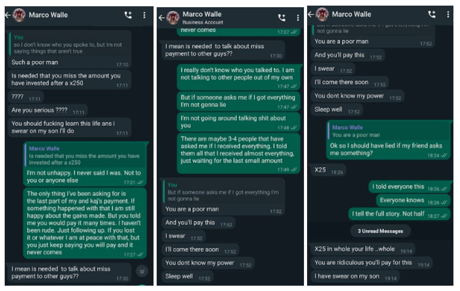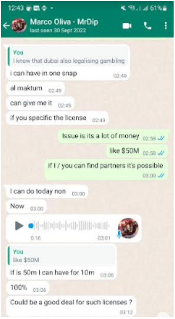 Some of these involve the victims requesting funds to be returned, with Marco making excuses to avoid paying out. In other cases, he uses aggressive and threatening behaviour in response to a request. His moral compass comes into question when an investor explains how the funds he invested are for the purpose of helping some misfortunate and ill children. He also makes claims to have ties with Dubai’s royal family. You will see in one statement, he boasts of having access to their database, along with potentially expanding some activities that are banned or considered illegal in the state of Dubai, such as alcohol, gambling & lottery.