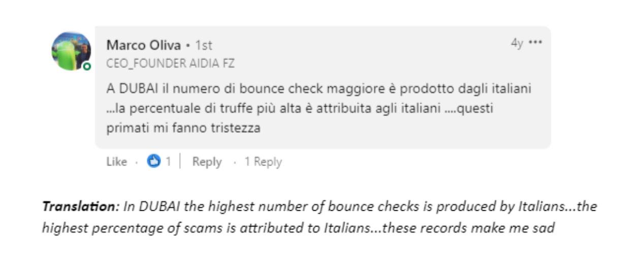 Marco makes the bold claim that in Dubai, Italians produce the most amount of bounced checks and, as a result, are recognised as fraudsters in the city.